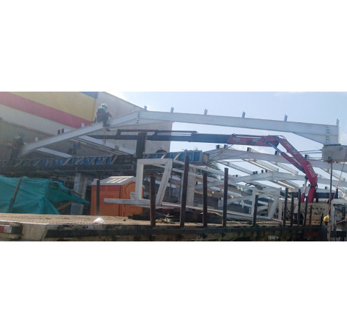 ALCANCES: Desmontaje, reparación, suministro y fabricación de estructura metálica del taller existente. Se realizó desmontaje, transporte y montaje de estructura existente (estructura, pórticos, correas, cimentación, placas de anclaje). Suministro de perfiles e instalación de cubiertas master 1000.